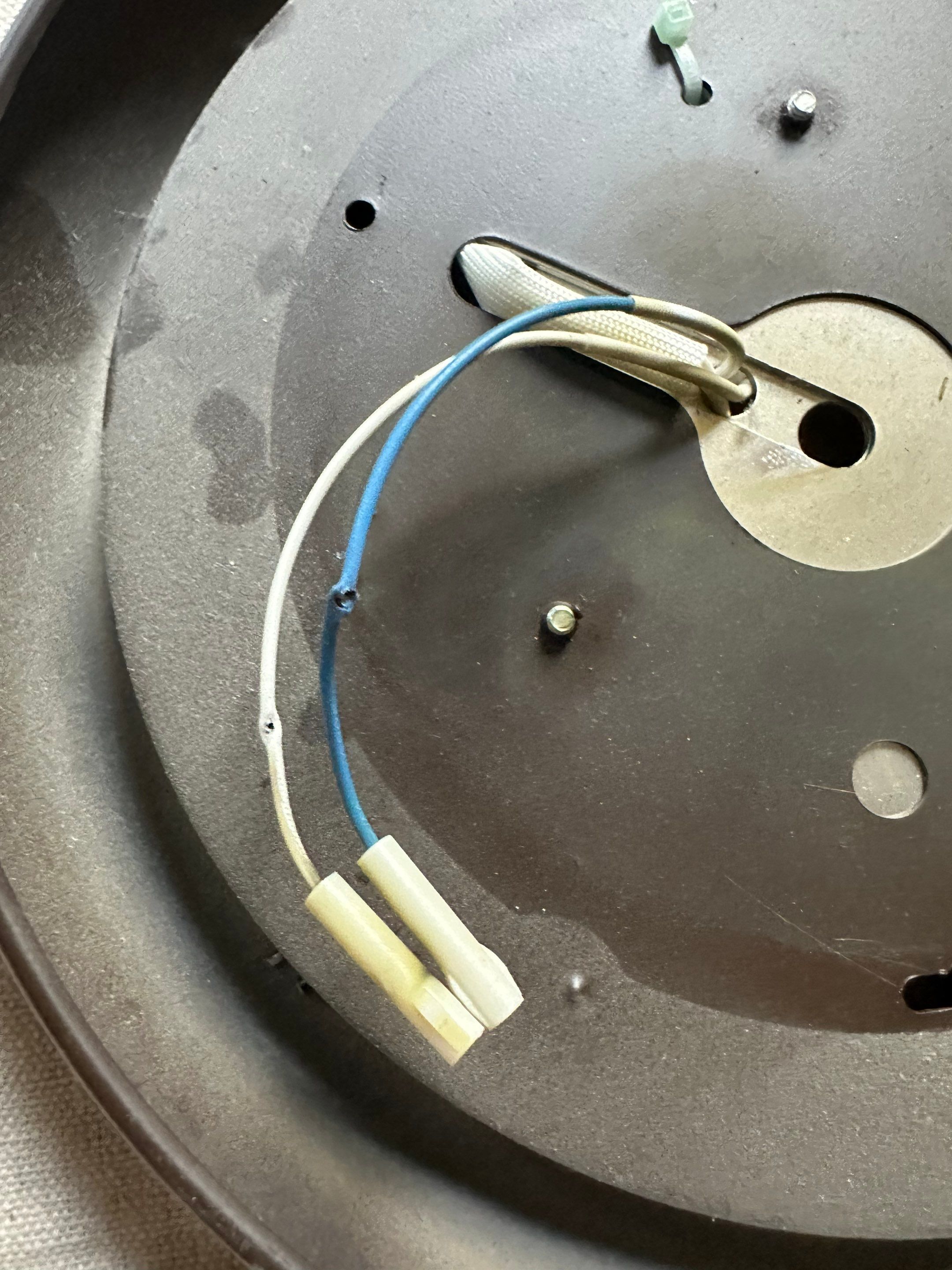We also installed proper strain relief and secured the wiring so that it would not be squeezed or rubbed when the fan was reassembled. After making repairs and restoring correct routing, the fan and light were reassembled and the connections were checked for proper tightness and insulation integrity.