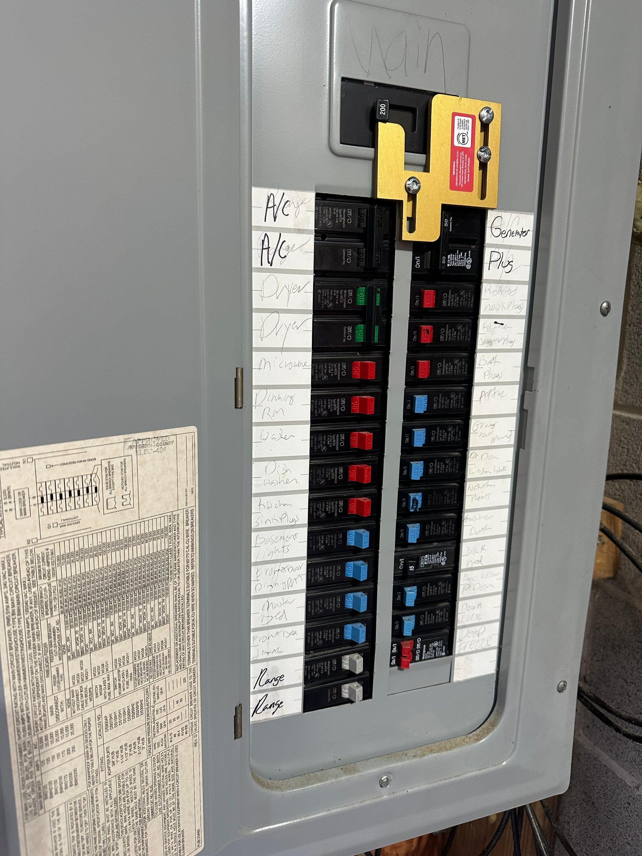 We labeled the circuits clearly so the homeowner knows which circuits can be powered during an outage, for example refrigeration, lighting, and other essentials. After installation we tested the operation to confirm the interlock and breakers functioned safely and correctly when switching from utility power to generator power and back again.